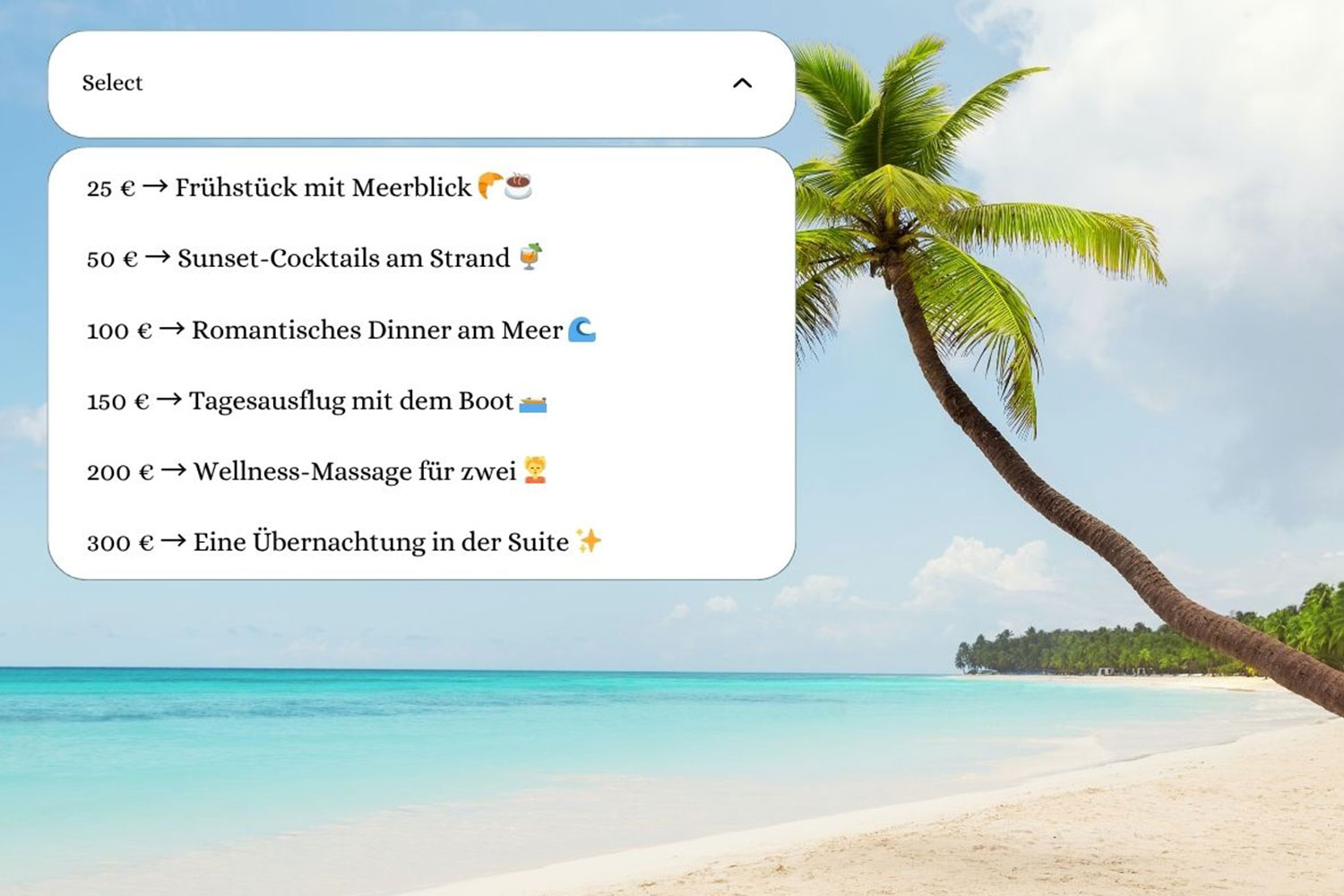Euer gesammeltes Budget fließt in eure Traumreise. Lasst uns gemeinsam die Flitterwochen planen, die perfekt zu euch passen – Schritt für Schritt zum Glück.